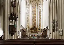 Its western gallery contains the famous Holy Blood altarpiece of the Würzburg wood carver Tilman Riemenschneider, carved 1500–1505, (illustrated below) which includes a rock crystal reliquary cross (c. 1270). The altar includes scenes of the entry into Jerusalem (right wing), Lord's Supper (shrine) with Judas as central figure and the Mount of Olives (left wing).[1]