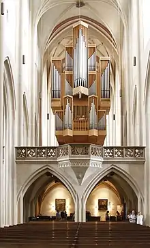 The great organ in St. Jakob was built by Rieger Orgelbau (Vorarlberg, Austria) in 1968, with 69 stops (108 ranks, c. 5,500 pipes), Tracker action and electric action for the stops. It can be played from the main console (4 manuals and pedal) and from a two-manual console on the back. The specification: