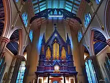 Over the principal entrance, a carved organ cover rises over a royal coat of arms, while Minton tile-work lies underfoot. The organ has 5000 pipes and includes the original gallery organ from 1853 over the main south entrance at the rear of the cathedral. Trumpet pipes have since been added to the gallery organ. The front chancel and aisle pipes were added in 1916.