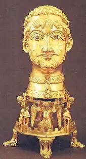 The church features a head reliquary, called Cappenberger Barbarossakopf.[3][1] The gilded bronze was made after 1155, possibly in Aachen. It is mentioned in a document of the Aachen Cathedral as a donation by Friedrich Barbarossa to his Godfather Otto of Cappenberg,[3] together with a silver bowl, the so-called Taufschüssel (baptism bowl) of Barbarossa. The recipient donated both treasures to the abbey.[1] The artwork is believed to be a portrait bust of the emperor,[3] but is probably rather an ideal image of an emperor, based on classical models.[3]