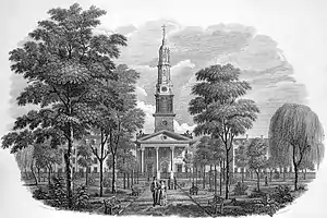 It was constructed in 1803 to designs by John McComb Jr. and his brother Isaac McComb on Varick Street, facing St. John's Park. McComb gave it a sandstone tetrastyle prostyle portico supporting a tower and multi-storeyed spire that rose to 214¼ feet. Master builders for the chapel have been recorded as T. C. Taylor, Henry Hedley, Daniel Domanick and Isaac McComb.[1] The chancel was added in 1857 to designs by Richard M. Upjohn.[2]