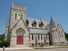 Construction of the present church began in 1875 and it was completed three years later. The church was designed in the High Victorian Gothic style by New York architect Henry M. Congdon. The rough-cut limestone for the walls was quarried in nearby Farley, Iowa.[4] The church follows a cross-shaped plan. It features a crenelated corner tower, recessed entryways, a rose window, roof dormers, and a shorter tower toward the back of the church that is capped by a spire. The larger tower was also designed to have an upper tower and a spire, but they were never built.[5] Five of the stained glass windows are from Louis Comfort Tiffany's studio.