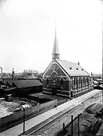 By the late 19th century, the population of Frederiksberg parish had grown to about 60,000 inhabitants. In 1892, a temporary church was therefore consecrated in the former gym hall of a local folk high school to relieve the pressure on Frederiksberg Church and the young Harald Ostenfeld, later Bishop of Zealand, was instituted as its first pastor.[1]