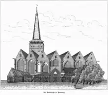 However, starting in 1245 Adalbrand's structure was replaced by a new early Gothic three-naved hall church erected by chapter and Prince-Archbishop Gebhard of Lippe, one of the few incumbents of the united see looking for a balanced performance in Bremen and Hamburg, preferring the title Bishop of Hamburg when staying in the diocesan territory right of the Elbe, as is known from seals and documents.[6] Prince-Archbishop Burchard Grelle consecrated the church as archdiocesan concathedral on 18 June 1329.