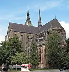 St. Mary's Church, Rostock, in German Marienkirche, is the biggest of three town churches found in the Hanseatic city of Rostock, in northern Germany. The other two are St. Peter's (Petrikirche) and St. Nicholas (Nikolaikirche). A fourth, St. James' (Jakobikirche), was heavily damaged during the Second World War and subsequently demolished. St. Mary's was designated in 1265 as the main parish church. Since the Protestant Reformation in 1531, it houses a congregation of the Evangelical Lutheran State Church of Mecklenburg.