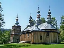 The tserkva in Turzańsk, established as an Eastern Orthodox Church tsekva, later Uniate, was referenced in the first half of the sixteenth-century. The present tserkva was built at the start of the nineteenth-century in 1801, and later expanded in 1836, with a foyer and sacristy. In 1896 and 1913, the tserkva had undergone renovations of its roof, strengthening it with tin. After displacing the Ukrainian populous from the area, as part of Operation Vistula, the tserkva was used by Roman Catholics, between 1947 and 1961. In 1963, the tserkva was returned to the Polish Orthodox Church.[2] The interior of the tserkva exhibits original components: iconostasis from 1895, and a polychrome from the turning point of the nineteenth and twentieth-century.[3]