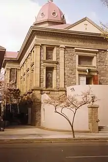 The church was originally designed by Otto Kleemann in the Second Renaissance Revival style; it is the only remaining Kleemann church in Portland. The original plans called for a brick structure, but with the foundation already laid, the material was changed to Clackamas County basalt.[4]