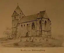 The present-day building dates from the 12th century.[6] It was built around 1100 with a flat ceiling and was a Wehrkirche (Fortified church). The tower, still standing today, was built in the 13th century. The church was an important medieval pilgrimage site. The church was damaged by fire in 1673 during the Franco-Dutch War leading to the destruction of the Romanesque apse. Replacing the apse, the chancel was built in 1688 with pointed windows in the Gothic style.[2][4]