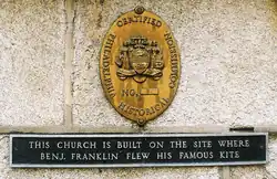 A plaque on the outside front wall, apparently unrelated to the oval Philadelphia Historical Commission marker above it, reads: "THIS CHURCH IS BUILT ON THE SITE WHERE BENJ. FRANKLIN FLEW HIS FAMOUS KITE," though the history of the marker is unclear, and apparently unrelated to the oval Philadelphia Historical Commission marker above it.