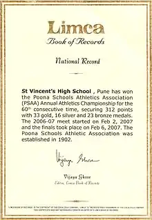 St. Vincent's has the notable record of winning the PSAA's (Poona Schools Athletics Association) Annual Athletics Championship for 60 consecutive years as of 6 February 2007. This achievement was recorded as a national record in the Limca Book of Records.[4]