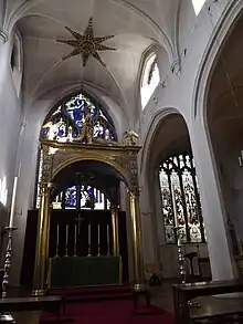 During the 1930s, the cathedral was renovated to commemorate the 150th anniversary of Seabury's consecration. There had been a plan to build an elaborate, cruciform cathedral with central tower, commemorating Bishop Seabury's consecration on the site currently occupied by Aberdeen City Council's headquarters. This was to have been a gift of the Episcopal Church in the United States of America, however, the Wall Street Crash halted this plan.[1] Instead, the existing church was enlarged and embellished by Ninian Comper. In 1938, the US ambassador Joseph Kennedy, accompanied by his 21-year-old son John F. Kennedy, opened an extension. Comper's decorative scheme is largely intact; it includes a vaulted ceiling with decorative panels depicting the arms of the then 48 US states and local families. The chancel has a large gold-painted baldachino and carved oak screen.[1]