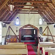 Internally, the nave floor is of hardwood tongue and groove boarding. Floor boarding is pencil-edged in the porch, and shot-edged in the vestry.[1] Hardboard lining which concealed the nave walls has been removed since 1987, exposing the boards and battens, which have been painted recently. Original shingles under the iron roof can be seen clearly over the nave, and remain unpainted.[1] Pews are of scrubbed beech.[1] The early structure of the church is evident and interesting in a picturesque setting.[1]