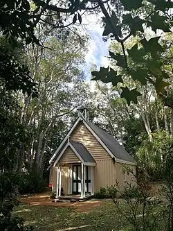 Originally the chapel stood amongst bunya pines and a number of flowering trees. It was separated from the road by a three-rail split post and rail fence with a picket gate. The early building had a shingled roof and double-hung, six-paned sash windows, and rested directly on the ground with a cement floor. The chancel and vestry are later additions.[1]