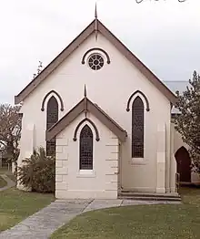 St Andrew's Church is a small stuccoed brick structure with corrugated iron roof built in the Gothic Revival style in 1890.[1]