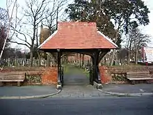 The churchyard is accessed by a rectangular Tudor-style lychgate, built of timber with a roof of red tile.[11] The churchyard is enclosed by a red brick wall. Together, the lychgate and boundary wall have been given a Grade II designation from English Heritage.[11]