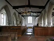 Inside, the nave and chancel are continuous, with no chancel arch, and there is a south aisle running the length of the church. The arcades have seven arches on the south side and six on the north side; the windows do not have stained glass. There are box pews, built around 1738.[1][4]