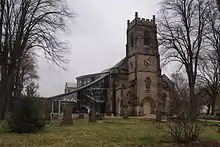 The church was built as a chapel of ease between 1822–23 to a design by Thomas Rickman.[3][4] The church was famous for its sixteen stained glass windows depicting scenes of the life of Jesus and stories from the scriptures, including the Raising of Lazarus, The Resurrection, The Good Samaritan and St Paul and St Barnabas,[5] which were also designed by Thomas Rickman.[6] It was consecrated on July 23, 1824.[7] The church was built by the Commissioners at a cost of £5,000, (equivalent to £470,000 in 2021),[8] £1,000 of which was collected through public donations.[9] In 1858, a district chapelry was assigned to the church.[10]