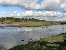 Four rivers feature in the eastern, northern and western boundaries of the community, tributaries one into another. In the east the modest Clemenstone Brook, and other small channels drain from wetlands at the eastern extremity of the community, including the Clemenstone Meadow SSSI.[6] These join the Afon Alun near Castle-upon-Alun. The River Alun forms the northern boundary for 5 kilometres (3.1 mi) as it flows north-west through the Alun Gorge, a deeply incised meandering valley, cut by glacial meltwater after the last ice age. It joins the River Ewenny south of Ewenny.[7] The River Ewenny then flows due west, and is the boundary of both the community and the county borough. Flowing through Ogmore Moor, and between Ogmore village and Ogmore Castle, it joins the River Ogmore, which in turn is the county boundary, flowing south-west for 2.5 kilometres (1.6 mi) between the steep rough limestone grassland of Ogmore Down and the vast sand dunes of Merthyr Mawr Common, to join the Bristol Channel through the broad sands of 'The Flats'.