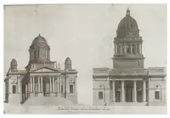 In his plan for Charlotte Square, Robert Adam designed a church for this site. Modelled after St Paul's Cathedral, it was to have an advanced portico with a pediment supported on coupled columns. Pavilions with pilasters on the corners would have flanked this arrangement while supporting small domes on peristyle drums. The central dome would have been similar, albeit shallower and with four pedimented faces on the drum.[16] By the time of St George's construction, concerns over cost and the waning popularity of the Adam style meant a new design was sought from Robert Reid.[22]