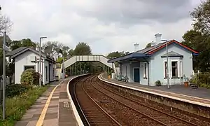 St Germans railway station (Cornish: Lannaled) serves the village of St Germans in Cornwall, England. The station is managed by Great Western Railway and is situated on the Cornish Main Line 10 miles 33 chains (16.8 km) from the line's northern terminus of Plymouth[1] and 256 miles 28 chains (412.6 km) from London Paddington via Box and Plymouth Millbay.[2] To the east of the station, the thirteen arch stone viaduct of 1908 (which replaced the original timber one built in 1859) takes the railway over the River Tiddy.[3]