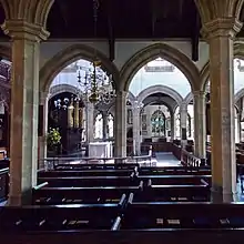 The church spire is a landmark of the town. The earliest parts of the church are late 12th- or early 13th-century. Some of the windows are 14th-century and the building was remodelled in the 15th and 16th centuries.[3] The building was restored in 1869–73 to plans by the Gothic Revival architect Henry Woodyer.[4] Of note within the church are the painted ceiling panels of the north aisle, dating from about 1390 and representing the Tree of Jesse.[5] The church is a Grade I listed building.[6]