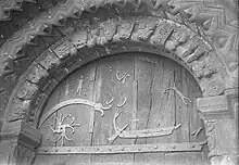 The most noted feature of the church is its door, which is at least as old as the church, but generally thought to date from the 10th century, and have been moved to the church when it was built.[3] Its ironwork includes the hinges, a cross, a ship, two figures, a tree, a horned figure, and a further figure on its own. In 1990, the door was taken to London, where it was restored by Plowden & Smith.[4] In 2002, it was returned to Stillingfleet, and rehung inside the church, with a new door constructed, with ironwork recalling that from the Saxon door.[5]
