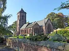 The church is built in red sandstone ashlar with a slate roof.[2] The plan of the church consists of a baptistry at the west end, a nave and chancel, north and south aisles with a chapel at the east end of each, a tower at the southwest corner and a south porch.[4] The tower has a small pyramidal spire. The chapels are Perpendicular in style while the rest of the church is Decorated.[2]