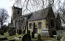 Most of the church is constructed in sandstone, with the nave in dressed gritstone. The roofs are in slate. Its plan consists of a west tower, a four-bay nave that extends to the north of the tower, a south porch, and a two-bay chancel with a chapel to its north. The tower is in Perpendicular style, is in four stages, and has diagonal buttresses, and a stair turret to the southeast. In the bottom stage is a west doorway with a Tudor arch, above which is a three-light window, and a clock face. The top stage contains two-light louvred bell openings with Perpendicular tracery. On the summit of the tower is a battlemented parapet, gargoyles, and crocketed corner pinnacles.[2]