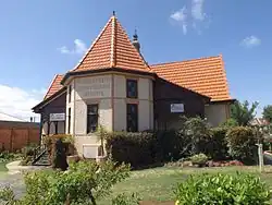 The single-storeyed building has a brick base and utilises a "hollow wall" construction system, consisting of a metal frame lined with chicken wire and a stucco render; a smooth finish trim with rough infill externally and smooth finish internally. A marble memorial plaque is located to the base of the north wall.[1]