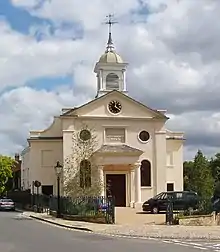 During a period in which much of the surrounding area was being developed, a new church was considered as an essential local amenity. The copyhold for the site of the church on Downshire Hill was purchased from the Manor of Belsize in 1812 by a group which passed this in 1817 to a trio comprising Christian minister James Curry, "speculative"[1] builder William Woods and lawyer Edward Carlisle, Woods being involved in other development, both in Hampstead and elsewhere in London.[2] Curry had offered to pay the cost of the building project if he was appointed minister.[3] The dedication of the new church to St John may indicate that it was originally intended as a chapel of ease for the parish church of St John-at-Hampstead.[3]