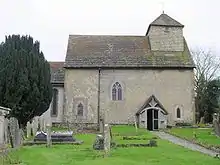 The nave formerly had a pair of porticus-style side chapels, but little trace of these remains—although blocked windows and fragments of archways and gabled roofs have been visible since 1918, when they were excavated.[3][11] The nave's dimensions are 43 by 22.5 feet (13.1 m × 6.9 m), and the walls are about 2.5 feet (0.76 m) thick.[10] The Norman doorway, reset on the north side in its 15th-century porch, have jambs with five stones of irregular length and a five-stone arch. The belfry, at the west end of the nave, sits on top of the roof with no structural link to the inside of the building. It has a shallow pyramid-shaped roof.[10]