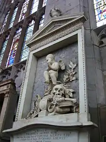 Ambrosia Sidney, (1565–1574), sister of Sir Philip Sidney and Mary Sidney who died at Ludlow Castle, aged nine, is buried near the altar under an impressive memorial bearing the arms of Sir Henry Sidney, (1530–1586), president of the Council of Wales and the Marches. His heart was brought from Worcester where he died and buried in a small leaden urn in an oratory near his daughter's tomb. The rest of his remains were buried with his wife Mary Dudley at Penhurst, Kent.[12]