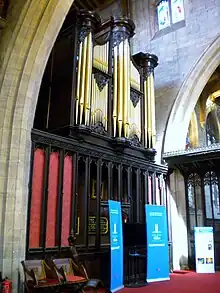 In the north transept is the John Snetzler organ. Through the generosity of Henry Arthur Herbert, 1st Earl of Powis, this organ was installed in 1764 at a cost of £1,000. Originally it was located in a gallery beneath the tower and had three manuals with 19 stops.[18]