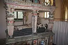 The most important monuments are in the chancel and the chapel. Behind the altar is the free-standing tomb chest of Sir Thomas St. Pol, who died in 1588, and his wife. On the sides of the chest are pilasters decorated with acanthus leaves, and the panels between them contain shields with wreaths. On top of the chest are effigies of a man and a woman. The man is dressed in plate armour and is holding a sword and a prayer book. His head rests on a helmet, his feet on a cushion. The woman is wearing a long dress, a cloak and a hat, and is holding a Bible. Above them is a canopy carried by six pillars. The entablature is decorated with an egg and dart frieze. On the top of the canopy, above each pillar, is the statue of a weeping figure. In the centre is an altar, in front of which is a kneeling female figure, and on the top is a male figure, also kneeling. The whole monument is painted and gilded. On the north side of the chapel is the tomb of Sir George St. Pol, who died in 1613, and his wife. On the side of the tomb are three niches. The central niche contains a carving of Sir George's daughter, and the lateral niches have mourning putti. On the tomb are two recumbent effigies, each lying on their right side, propped on an elbow. The nearer effigy is a female in mourning dress with a ruff and a hat, holding a prayer book. Behind in a higher position on a step is a male figure in plate armour, holding a sword. The effigies are contained in a semicircular-headed recess, the archivolt of which is decorated with roses. The back wall has an inscribed panel surrounded by scrolls and memento mori. At the sides are pillars supporting a frieze and an entablature. On top of the monument are flaming urns, an achievement of arms, shields and obelisks. In the north wall of the chapel is an alabaster painted and gilded plaque to Robert Rich, 1st Earl of Warwick who died in 1619. It contains a circular medallion carved with the head and shoulders of the deceased, behind which is the profile of his wife. On each side are pilasters, and above is an entablature carrying a coat of arms and heraldic supporters. Underneath is a panel inscribed with a poem.[1] This memorial is thought to have been made by Epiphanius Evesham.[2] Elsewhere, on the east wall of the chapel and the south wall of the chancel, are brass memorial plaques.[1]