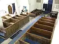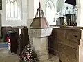 The Font is often described as exhibiting the Early English Gothic style associated with a period slightly earlier in the 13th century than the rest of the church. The nave features eighteenth century box pews which enclose som earlier seventeenth century bench ends.[8]:232