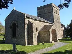 The Norman structure has a three bay nave with a south porch and chancel. The short two-stage tower is central and has a quadripartite vault below it.[3] The door in the porch is round headed and has columns on either side. The outside of the building has five Romanesque corbels including one with double human heads which may be from a later period. The 12th century font consists of a cylindrical stem on rectangular blocks. The bowl is square and decorated on three faces.[4][2]