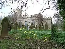 The lych gate built in 1891 is listed at Grade II.[10] In the churchyard the box tomb of Samuel Brady dated 1814 is also listed at Grade II.[11] In 1958 a cross base for twin Anglo-Saxon crosses was discovered in the churchyard. It is listed at Grade II,[12] and is a Scheduled Monument.[13] The churchyard also contains the war graves of six soldiers of World War I, and a Merchant Navy Master, an army officer, and a sergeant of World War II.[14]