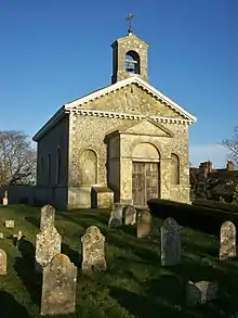 The walls are faced with knapped flint and have an ashlar base. In the tympanum of the pediment above the west wall, the coat of arms of Richard Trevor is displayed in Portland stone. Above the pediment is a bell, housed in an open ashlar belfry.[1][2][4]