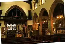 The current rood screen was erected in 1905 as a memorial to Queen Victoria, at a cost of £250.[6] In 1931 the crucifix and figures of St Mary (on the left) and St John were added. The choir stalls all belong to the Victorian restoration.