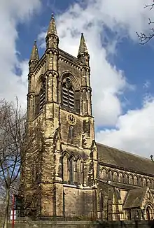 St Mary's Church is the parish church of the town of Mirfield in West Yorkshire, England. The current building is a large Gothic Revival structure designed by Sir George Gilbert Scott, replacing an older structure, the tower of which still survives a short distance from the present building. These structures form Mirfield's most prominent landmark and both are listed for preservation by Historic England, the old church tower as Grade II[1] and the present building as Grade II*.[2]