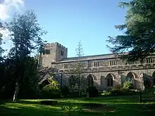 The church is constructed in sandstone and limestone rubble with red sandstone dressings and slate roofs. Its plan consists of seven-bay nave with a clerestory, north and south aisles, a south porch, a chancel, and a west tower. The tower, dating from the 16th century, is in three stages, with buttresses at the angles, and an embattled parapet. It contains a west doorway, above which is a three-light window containing Perpendicular-style tracery. The bell openings have three lights, are louvred and have hoodmoulds. The north wall of the nave contains pointed windows with Perpendicular tracery, all with two lights, other than the western window, which has three lights. The west window has five lights. The windows in the clerestory have flat heads and three lights, and are mullioned. The south wall contains a priest's door, with four windows to its left and two to the right; all have two lights. The porch is gabled and has a cross finial. The east window in the chancel has five lights.[2] The inner doorway dates from the 12th century, it is in Norman style, and has zigzag decoration. Hyde and Pevsner in the Buildings of England series state that it is neither complete, nor is it in its original position.[7]
