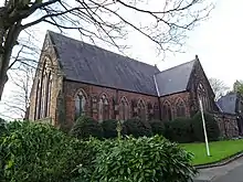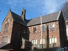 The school was built in 1869, with its entrance in Mount Street. It is constructed in red sandstone with a slate roof. The school is in two storeys and has a nine-bay front, the central bay projecting forward under a gable. The windows in the ground floor have three lights under ogee heads; those in the upper floor have two lights under cusped heads. In the gable of the projecting wing is a rose window. The school is also listed at Grade II.[3][8] The school building is now used at the Parish Hall and the ground floor is a Nursery.