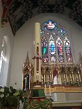 Inside the church, the high altar and reredos date from 1865, and were probably designed by E. W. Pugin. They were separated in 1948–50 by Weightman and Bullen, who placed the reredos against the east wall. The stained glass in the east window dates from 1878, and is a typical design by the Belgian stained glass painter Jean-Baptiste Capronnier.[3] The two-manual pipe organ was built by Franklin Lloyd in 1895, and is situated in a gallery on the north wall of the church at the west end.[6]