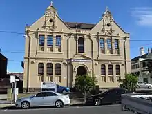 During the early 1890s plans for a completely new church were well underway, and, hampered only by a lack of funding, work progressed slowly. The new church opened in February 1900 while the old church became both a parish church hall and classroom. By 1907 the school was offering classes for girls up to the Merit Certificate (Grade 8) level. The old building was soon after condemned by the local board of health which necessitated the need to draw up plans to build a new girls school. Demolition of the old church was completed in 1913 and the foundation stone for the new school was laid early the following year. The new school was to cater for 500 students and so a two-story building of red brick, comprising nine classrooms, was constructed on Victoria Street.[4] On 5 July 1914 the building, designed by Kempson and Conolly, was formally opened by Archbishop Mannix.[5]