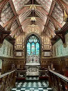 Much of the decoration and the church's stained glass in the east window was created by Charles Eamer Kempe whom King Edward VII had also commissioned in 1903 to create a stained glass window for Buckingham Palace of his eldest son, Prince Albert, Duke of Clarence.[9][10] The church's silver altar and reredos, created by the silversmiths Barkentin & Krall, were presented to Queen Alexandra by the American department store owner Rodman Wanamaker as a tribute to Edward VII. He also presented her with the silver pulpit and a silver 17th-century Spanish processional cross. Of note also is a Florentine marble font and a Greek font dating to the 9th-century.[7][11]