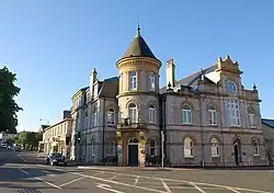 The design featured a symmetrical three-stage circular tower on the corner of Fore Street and Manor Road: there was a doorway with a fanlight and an archivolt flanked by brackets supporting a balustraded balcony in the first stage, a French door flanked by smaller round headed windows in the second stage and three windows flanked by pilasters in the third stage with a modillioned cornice and a conical roof above. The Manor Street frontage of four bays involved, in the three right hand bays, a central rounded headed doorway with an archivolt flanked by round headed windows on the ground floor and a rectangular three-light window flanked by round headed windows on the first floor. The gable above, which contained a large oculus, was flanked by balustrades surmounted by finials.[1] There was a four bay section in Fore Street which was fenestrated with round headed windows with archivolts on the ground and first floors and with dormer windows on the second floor.[1] Internally, the principal rooms were the council chamber, a meeting room on the ground floor and a large assembly room on the first floor.[2]