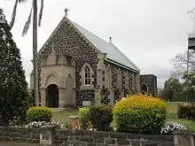 The church is surrounded by palm trees and a low wall has been constructed at the front in the same bluestone as the church walls.[1]