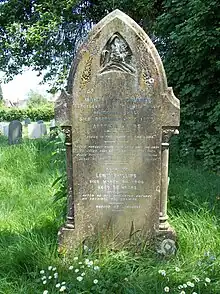 Further churchyard grave markers are to the murdered parish constable Henry Trigg;[12] to Thomas Beard (died 1800?); and to Mary Ann Griffin (died 1899 aged 34), wife of Lewis Phillips of Berden Hall. The Beard stone contains a serpentine moulding at each side of the top meeting a central circular moulded device, defining three engraved fields, and all with carved pictorial details, the central an angel holding an anchor. An overgrown slab running from the stone contains a similar circular engraved device. The Griffin stone is chamfered-arch topped with inset floral carving, semi-circular side columns topped with floriate capitals, and inlaid inscriptions. Near to the Griffin stone is a plinth tomb with moulded base, and overhanging top with dentils below and a pyramid top. It is to members of the Roberts family, one of whom was Roland Brandram Roberts of Kirimetiya Estate, Ceylon (died 1910 aged 46), who was cremated at Golders Green, with his ashes interred in Berden graveyard. Two marble and granite sarcophagus-style tombs are to the north of the church; one to George Seabrook (died 1885); the other Thomas Seabrook (died 1847) and his wife, Elizabeth (died 1871). George and Thomas Seabrook were of Berden Priory. A further headstone is to Brigadier Sir Francis Smith Reid and his wife. Reid was a senior British Army officer during and after the Second World War, and Secretary to the Speaker of the House of Commons.