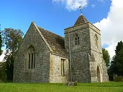 The church can only be approached by a pedestrian footpath.[8] The redbrick chancel was built between 1199 and 1221, with the nave being added in the 14th century and built of sarsen stone.[1][9] On the south wall is a scratch dial.[10] The interior has a font from the 13th century and a rood screen from the 15th.[9] The pulpit, altar rail and pews are from the 19th century.[1] There is a trefoiled piscina, a shallow basin used for washing the communion vessels.[1] Monuments include wall tablets to Henry Webb (died 1776), John Nalder (1794), and Elizabeth Nalder (1835).[1]