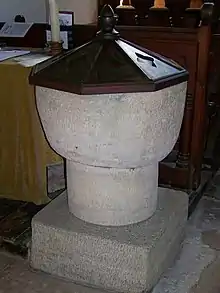 There is a 12th-century font,[9] which was found in a hedge in the 1920s.[10] There is a reed organ at the west end of the church.[11] The East window is a late window by C.E. Kempe, dating from 1904, and depicts Noli me Tangere and is a memorial to George and Jemima Mansell.[12]
